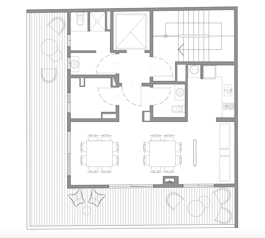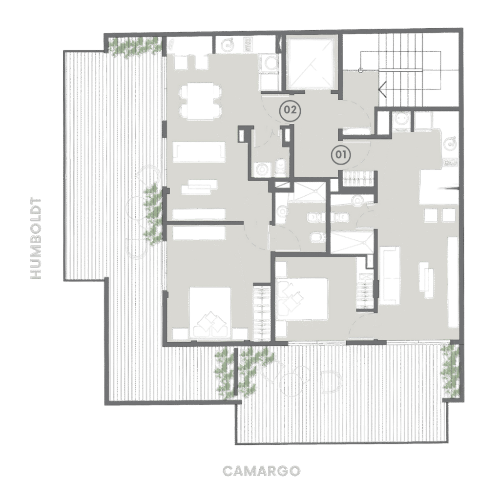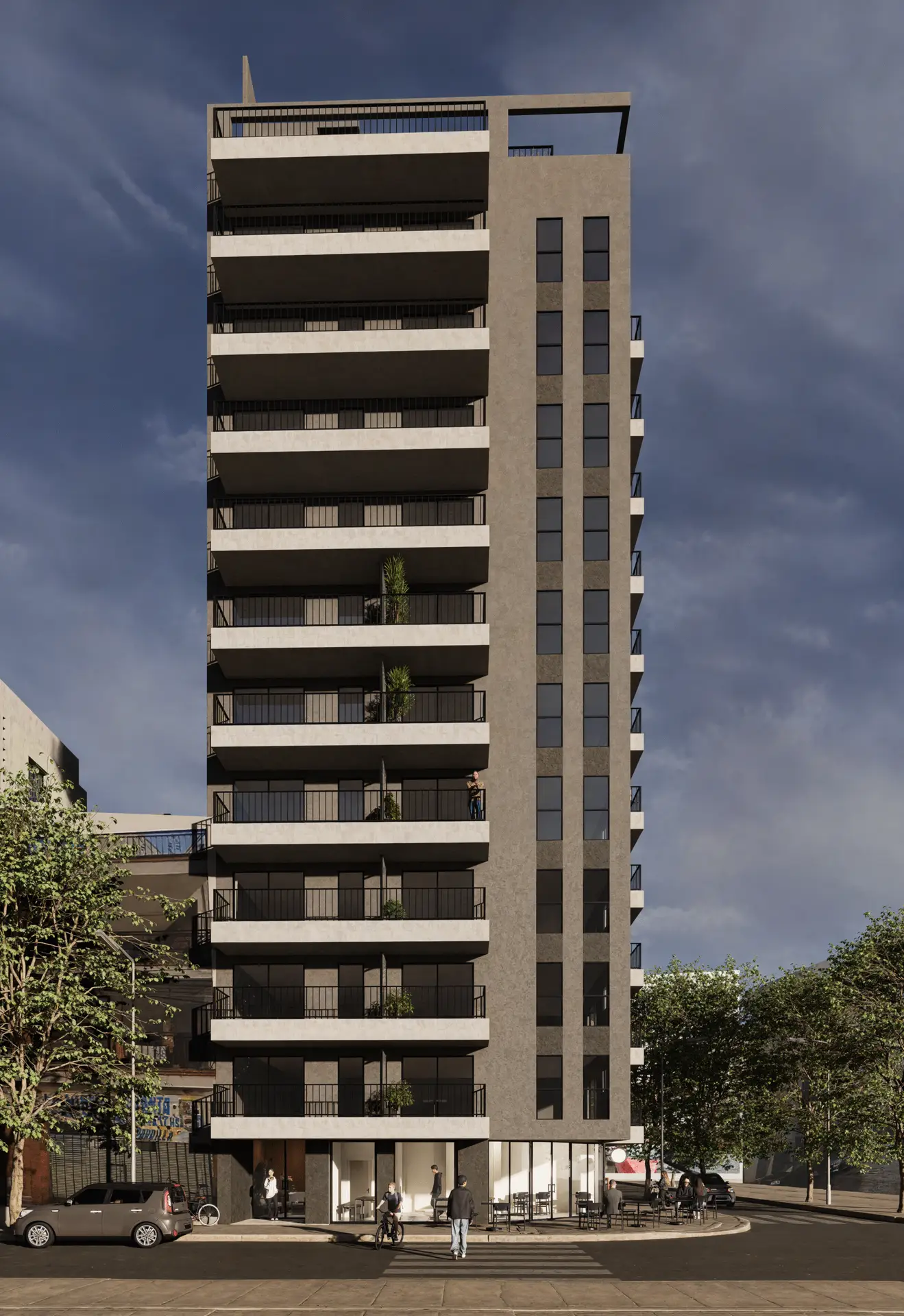 En la Planta Baja dos locales comerciales aportan vida y movimiento al frente del edificio, fusionando el dinamismo del entorno urbano con la intimidad del espacio residencial.
